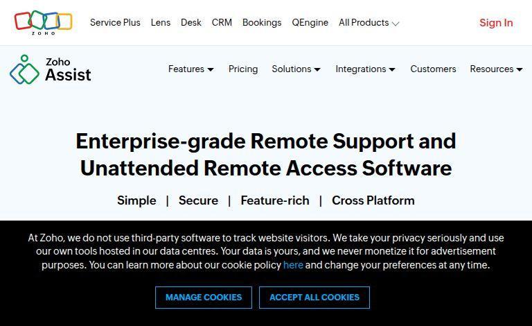 Zoho Assist helps you connect to customers’ devices to remotely assist them in fixing problems. This feature is helpful if you sell digital products or software.
